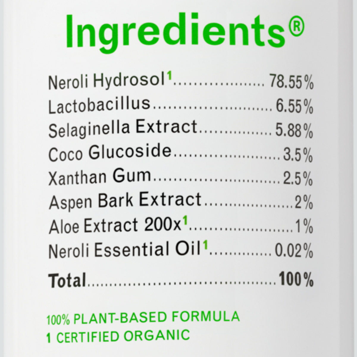 Citrus aurantium amara (bitter orange) Floral Water*, Lactobacillus ferment, Selaginella Lepidophylla Extract, Coco Glucoside (and) Aqua , Xanthan Gum, Populus tremuloides Bark Extract, Aloe Barbadensis leaf juice powder *, Citrus aurantium amara (bitter orange) flower Oil *