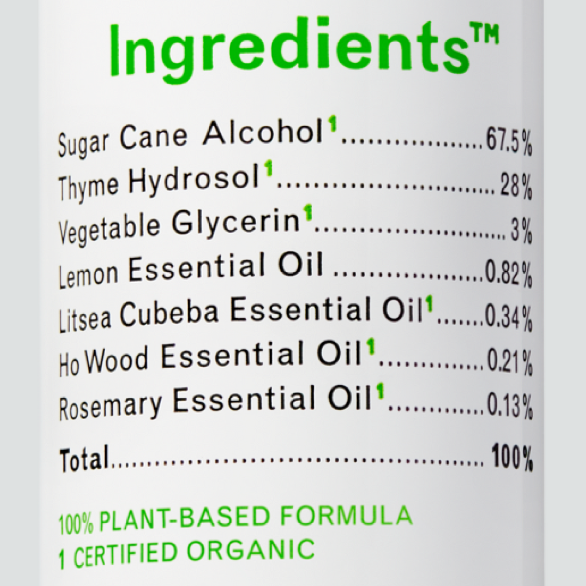 Ethanol *, Thymus Vulgaris Water *, Glycerin *, Citrus Medica Limonum (lemon) Peel Oil, Litsea Cubeba Fruit oil*, Cinnamomum camphora linalooliferum wood oil *, Rosmarinus (rosemary) Officinalis Leaf Oil *